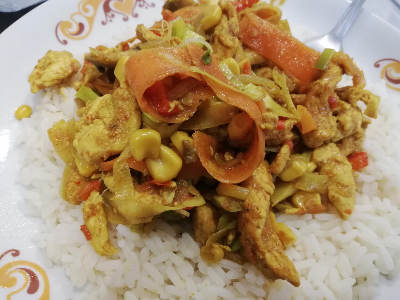 Oliwę lub olej rozgrzać na głębokiej patelni. ebulę pokroić w półksiężyce, czosnek rozgnieść nóżem i pokroić w kostkę. Zeszklić, dodać pokrojony w paseczki kurczak. Podsmażyć i przyprawić carry