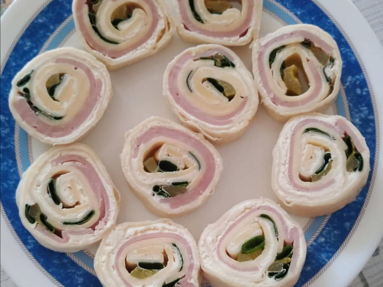 Placek tortilli smarujemy serkiem kanapkowym, układamy, szynkę-ser żółty-poktojony w paski ogórek-szczypior. Dodatki są tylko kwestią wyobraźni. Zwijamy w folię spożywczą ściśle. Do lodówki na 30 min. Kroimy. Gotowe.