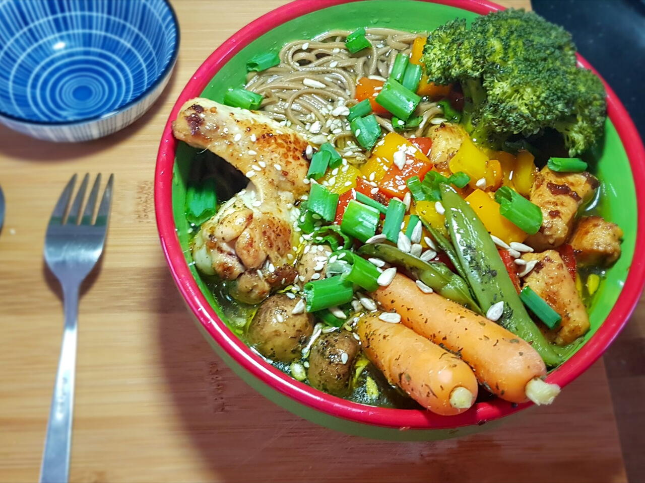 Krok po kroku opisałem bez dodatkowych zdjęć za co przepraszam (karta w telefonie odmówiła posłuszeństwa). Ale gotowanie makaronu, smażenie kurczaka czy też papryki jest takie jak zawsze. Smacznego