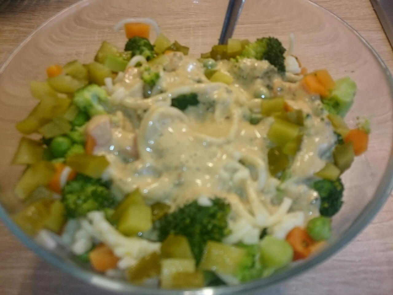 Kiedy makaron i warzywa bedą już gotowe to następnie wrzucamy je do miski razem z sosem i gotowe. Smacznego!