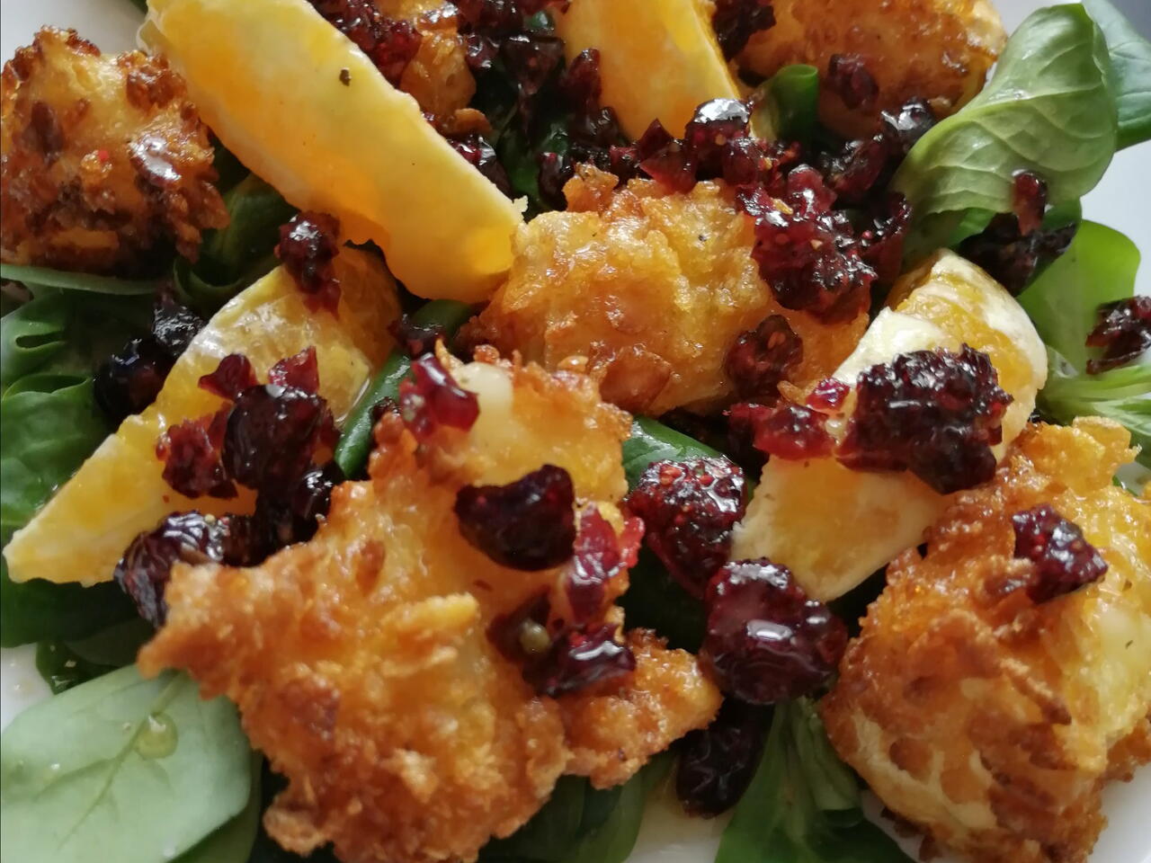 Sos : do miseczki wlewamy oliwę z oliwek, sok z pomarańczy. Żurawinę siekamy drobno i dodajemy do oliwy. Doprawiamy.