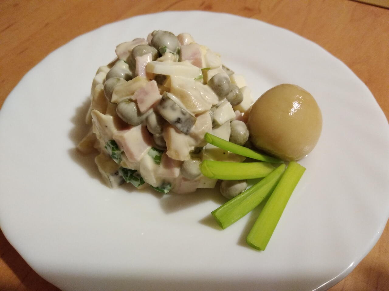 Składniki kroimy w kostkę, przyprawiamy, mieszamy z 2 łyżkami majonezu.