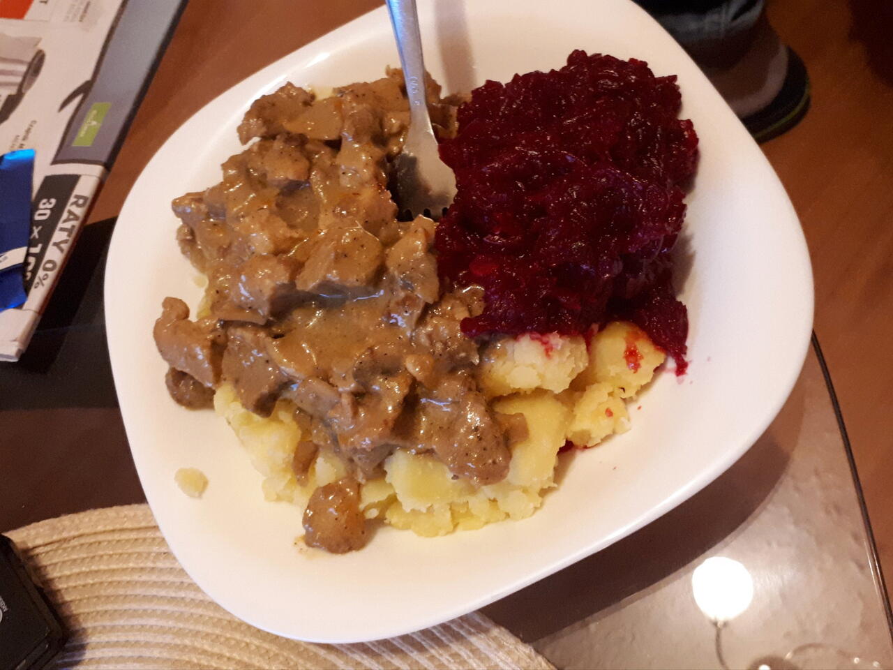 Gotujemy do miękkości mięsa. W małej ilości wody rozrabiamy łyżkę mąki. Wlewamy do sosu i zaprawiamy śmietana. Doprawiamy solą i pieprzem do smaku.