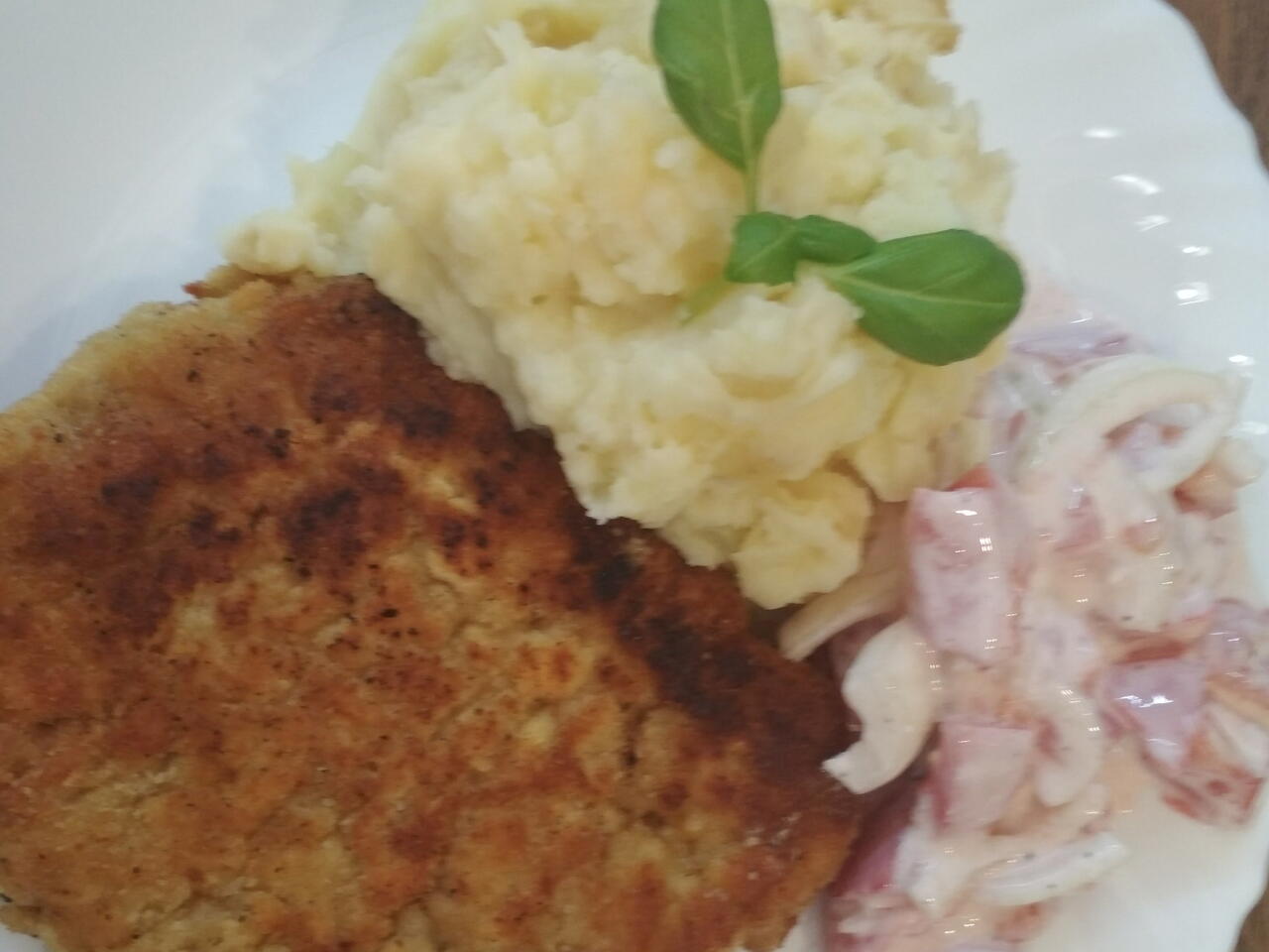 Schab rozbić i zapanierowac w podwójnej panierce (mąka, jajo, bułka, mąka jajo bułka)