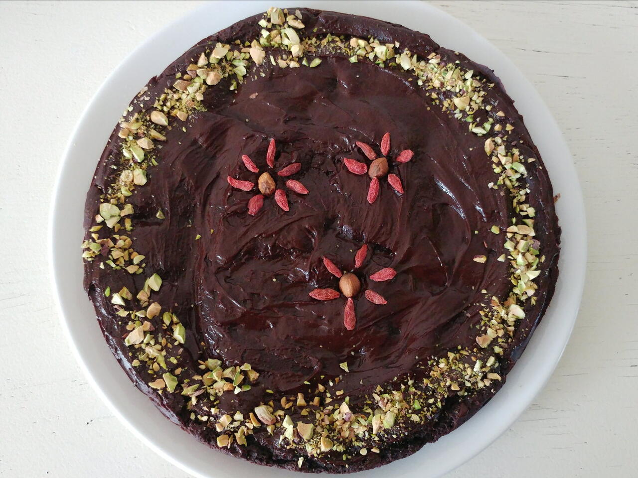 Rozpuść resztę czekolady z kilkoma łyżkami wody w kąpieli wodnej i polej ciasto. Udekoruj orzechami lub owocami.