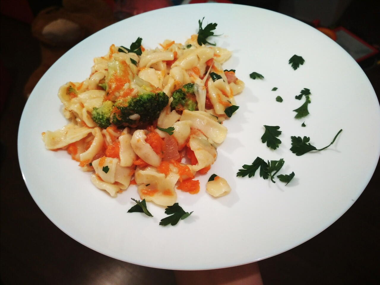 Pokrój dynie w kostkę, dolej odrobinę wody i duś pod przykryciem dopóki nie zacznie się rozpadać. Rozgnieć ją i dodaj do makaronu z brokułem.