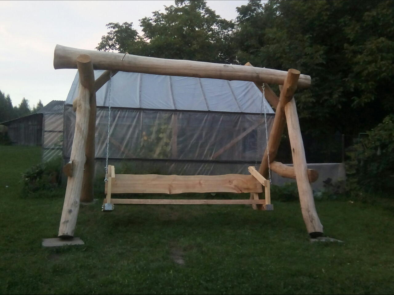 Trzeba zaciąć drewno przewiercić skręcić szpilkami i dźwigiem wszystko ustawić . Wymiary górnej belki to 4.30m x 30cm. Długość siedzenia 2.50m
