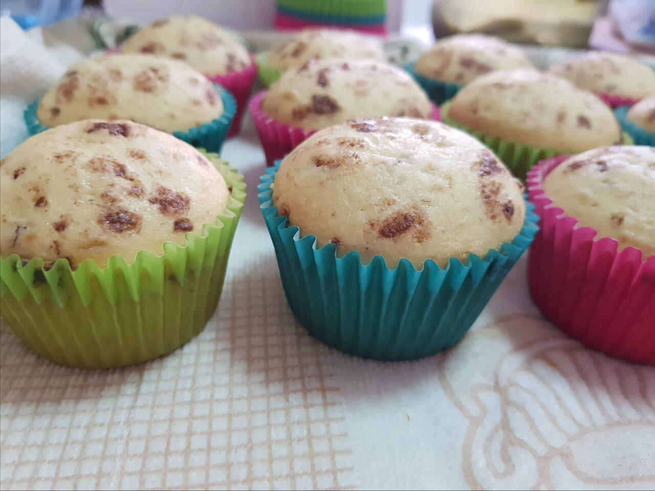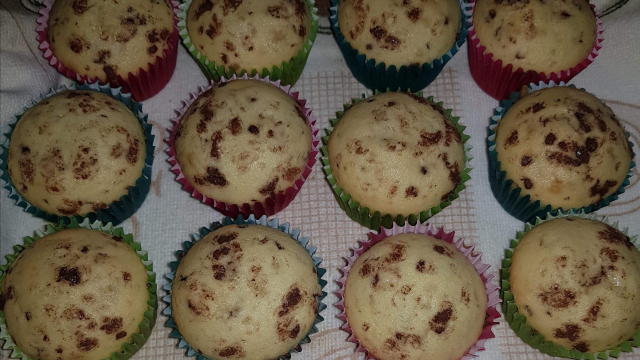 Eu am.pus ciocolata rasa in compozitie,dar se pot face si simple si cu fructe ..cu ce doriti! Se pune compoziția in formele de hartie cam 3 sferturi .Se tin la cuptor cam12minute sau pana ce iasa scobitoarea curata