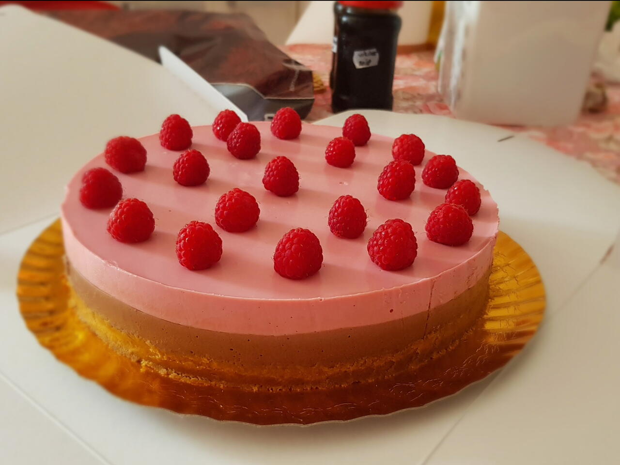 Vom pune smântână pentru gătit la încălzit, într o cratiță, împreună cu zaharul. Vom pune gelatina la hidratat în apa rece. Când zaharul s a dizolvat, vom lua amestecul de pe foc și în el vom pune gelatina. Amestecam pana se dizolva. Lăsăm amestecul deoparte și ne ocupam de ciocolata. O punem într o cratiță și o topim și pe cea cu lapte și pe cea amăruie la foc foarte mic. Acum ne ocupam de zmeura. Le vom vom pasa cu un Blender vertical și le vom trece printr o sita, pentru a scăpa de semințe.