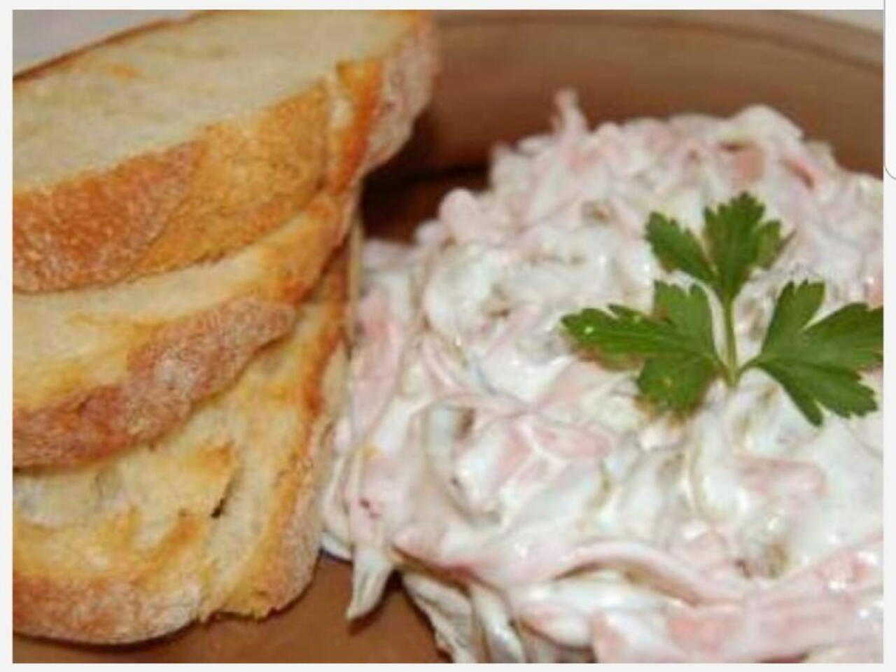 Sunca si castravetele se taie fasii, se amesteca cu maioneza, sare si piper dupa gust.