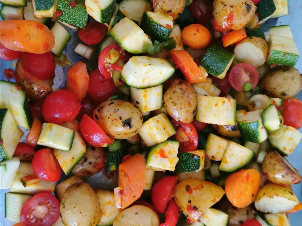 Se taie toate legumele bucatele. Se pregateste recipientul cu uleiul de masline. Se adauga toate legumele se condimenteaza si amestaca bine. Se da la cuptor 25 min la foc mediu.