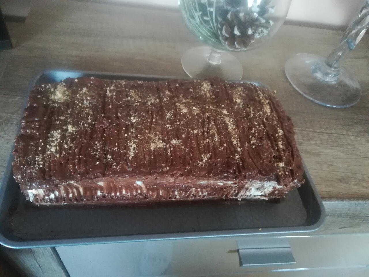 U vruću slatku pavlaku dodati 200 gr čokolade . Premazati tortu. Vratiti u frižider bar sat vremena.
