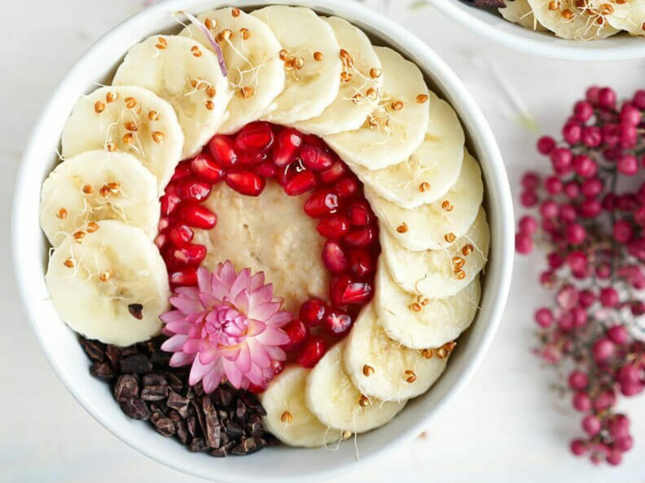 Украсить фруктами и ягодами. По желанию, семечками и какао бомбами.