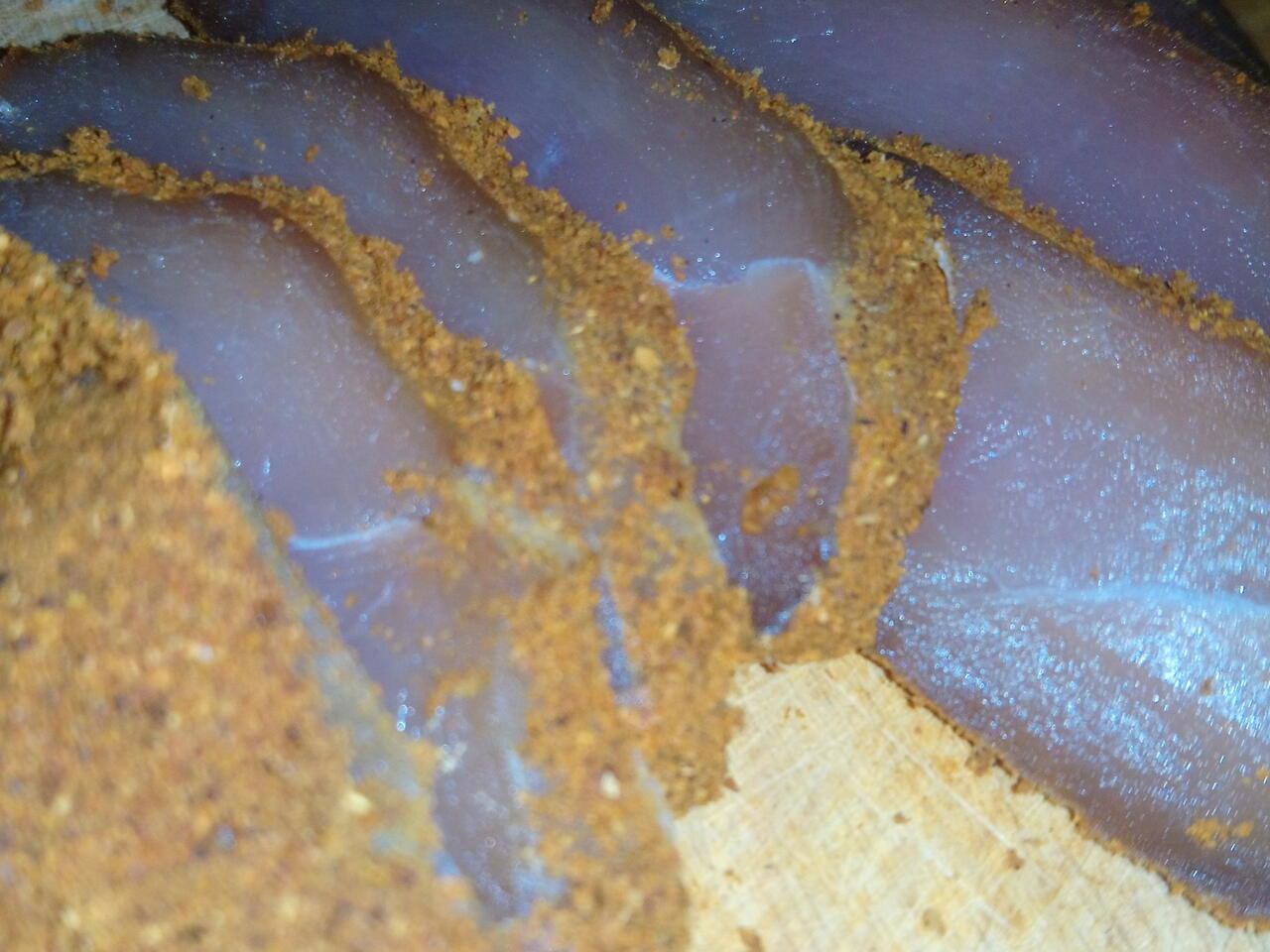 Вымоченную, еще мокрую грудку нужно обвалять в специях (я брала готовую смесь для курицы или можно взять 2 ч.л. красного перца+6 ч.л. паприки+4 ч.л. сушенного чеснока или еще вариант 2 ч.л. кориандра+2 ч.л. чеснока+1 ч.л. красного перцв+1 ч.л. паприки). Грудка полностью должна быть покрыта в специях.