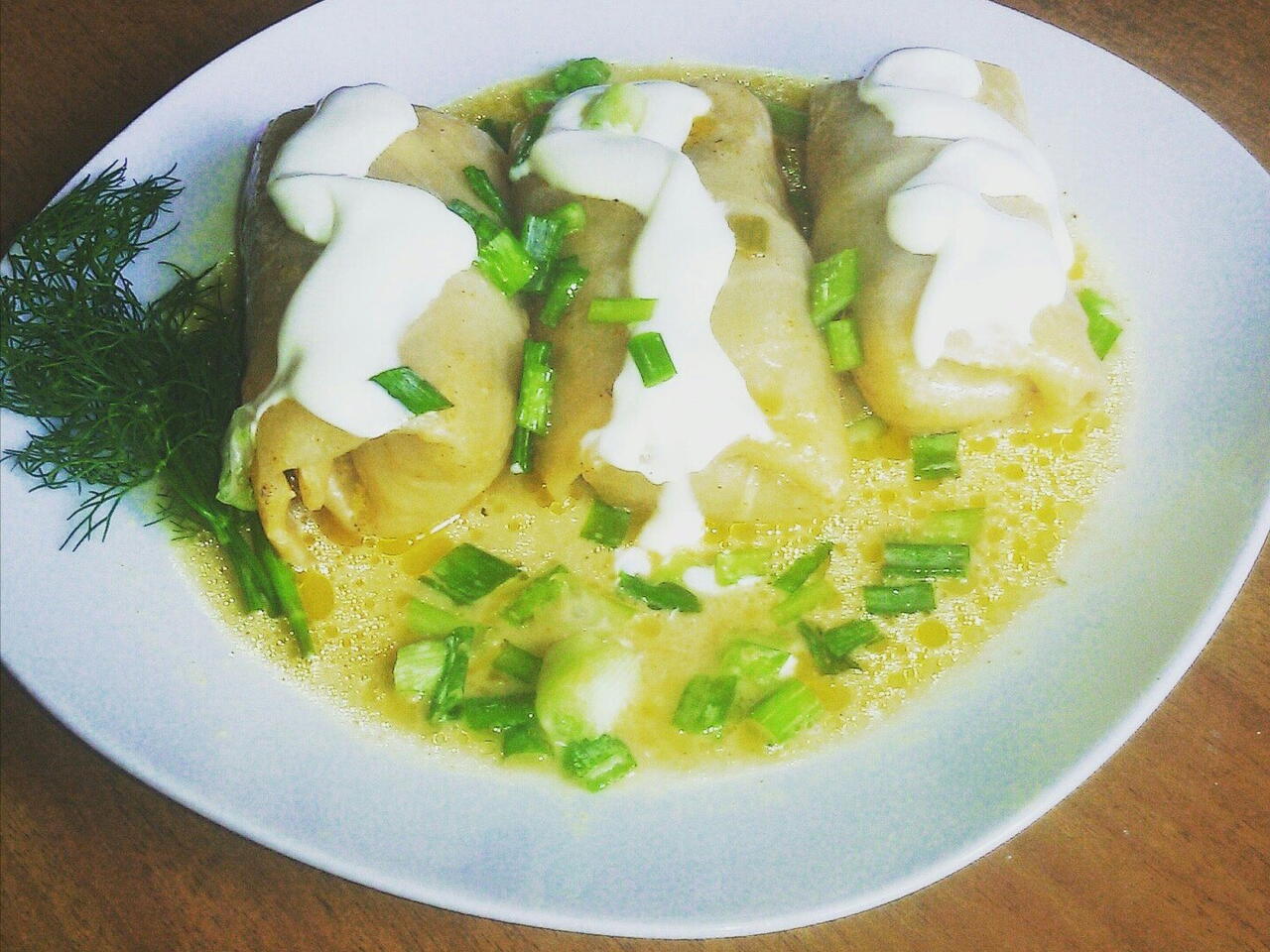 5. Выложить голубцы в кастрюлю, добавить лавровый лист и перец горошком. Смешать сметану с томатной пастой и залить полученным соусом голубцы.6. Готовить на слабом огне под закрытой крышкой около 60 минут.7. Подать голубцы горячими и украсить зеленью.