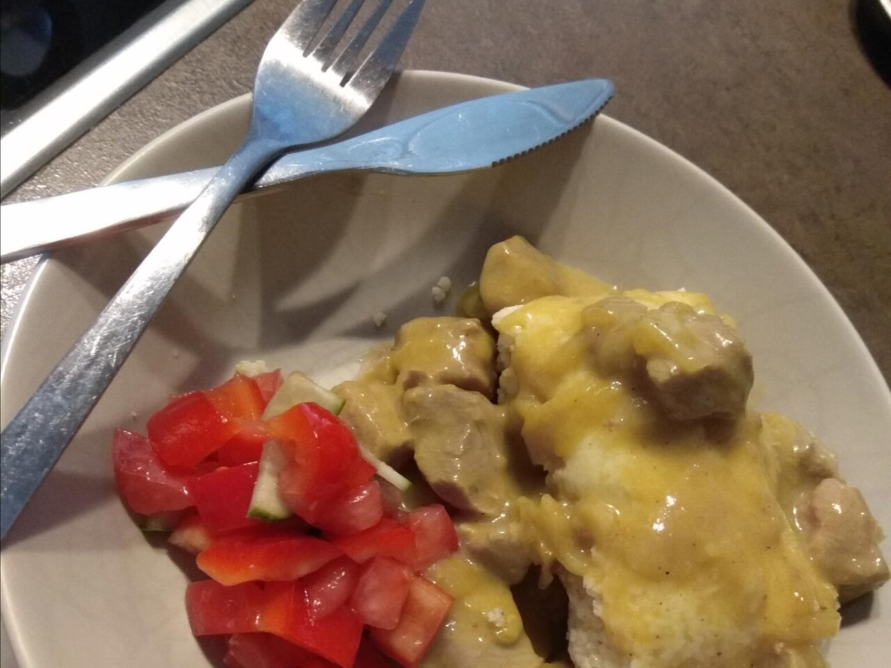 Крахмал развести в 50 мл воды, влить в кастрюлю, хорошо перемешать, выключить огонь и оставить на плите. На гарнир идеально - любая крупа или картофель. Приятного аппетита!