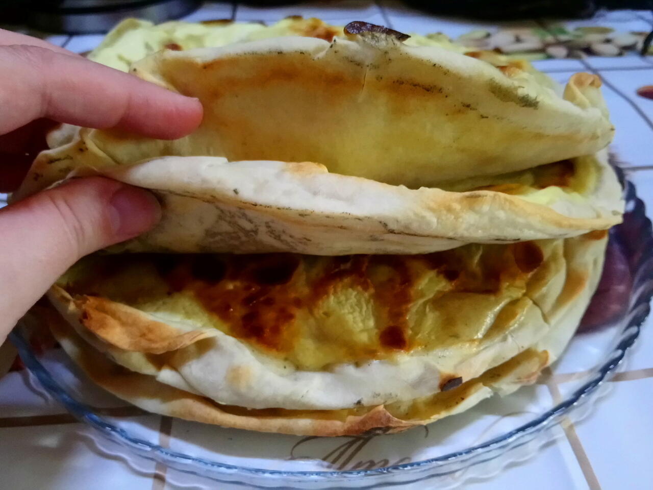 Убрать еще на 5-6 минут в духовку (250 градусов). Как заливка подзолотится – лепешка готова.