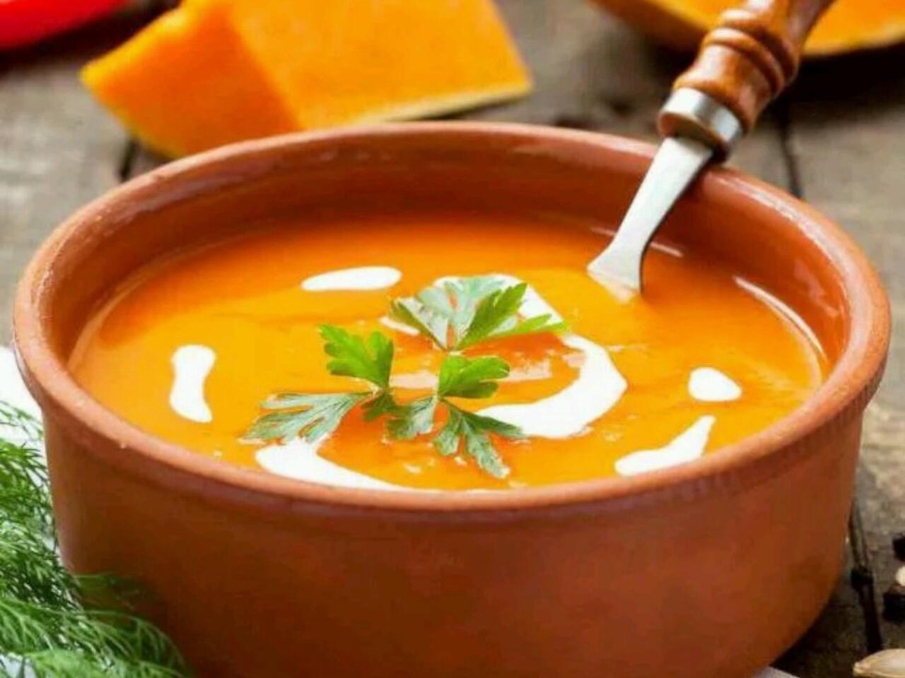 Разлить суп-пюре по тарелкам, добавить свежевыжатый сок апельсина, украсить карамелизированными семечками, сладкой паприкой, добавить сметану или сливки и подать со свежим белым хлебом с хрустящей корочкой.