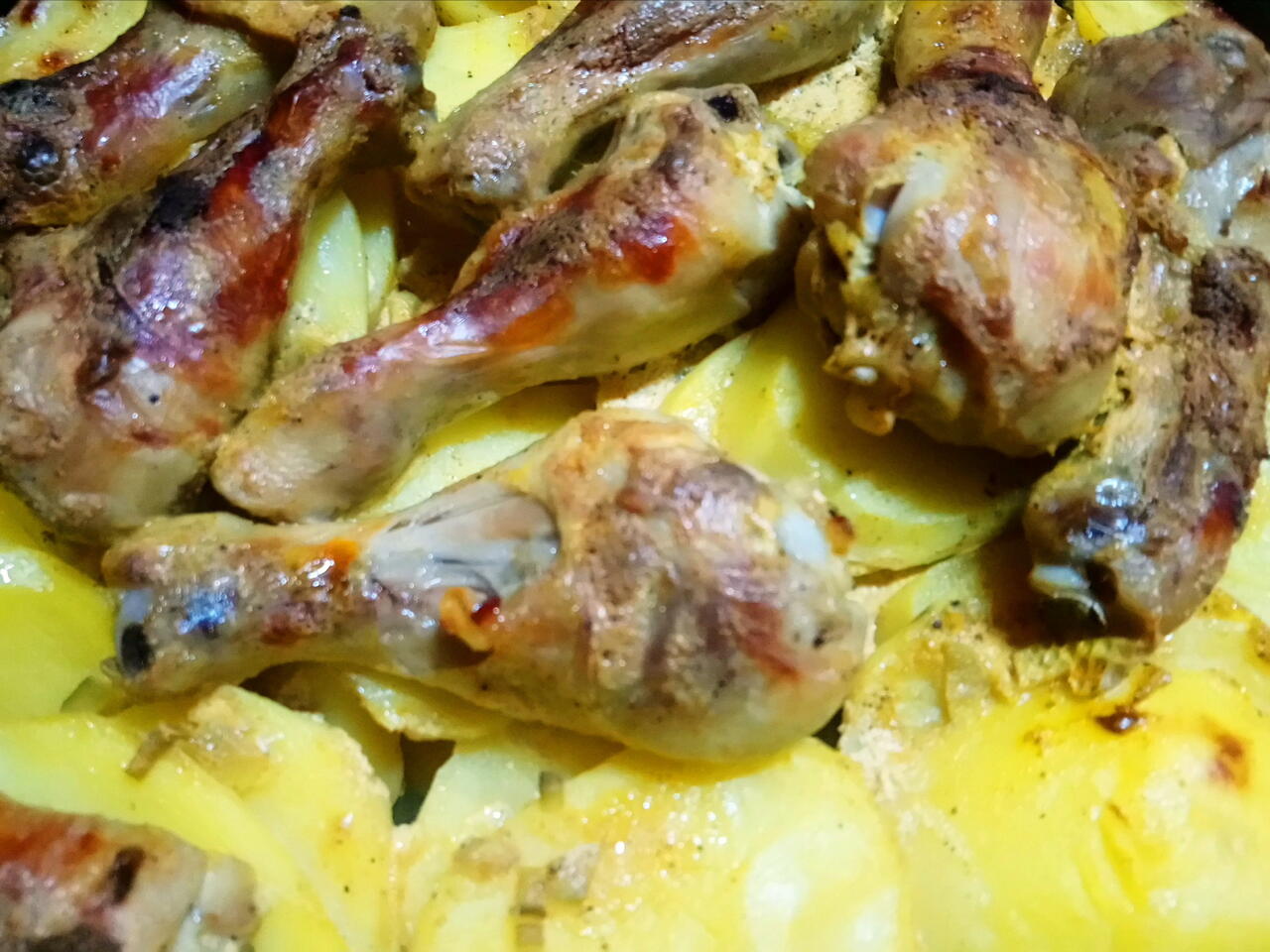 Сверху курицу поливаем оставшейся сливочной смесью. Накрываем фольгой и ставим на средний уровень заранее разогретой до 220 градусов духовки, примерно на час. Минут через 40 проверьте ваш картофель на готовность (у меня картофель был готов через 60 минут). Если он уже практически готов, снимаем фольгу. Уменьшаем температуру в духовке до 190 градусов и запекаем до зарумянивания курицы, 20-30 минут.