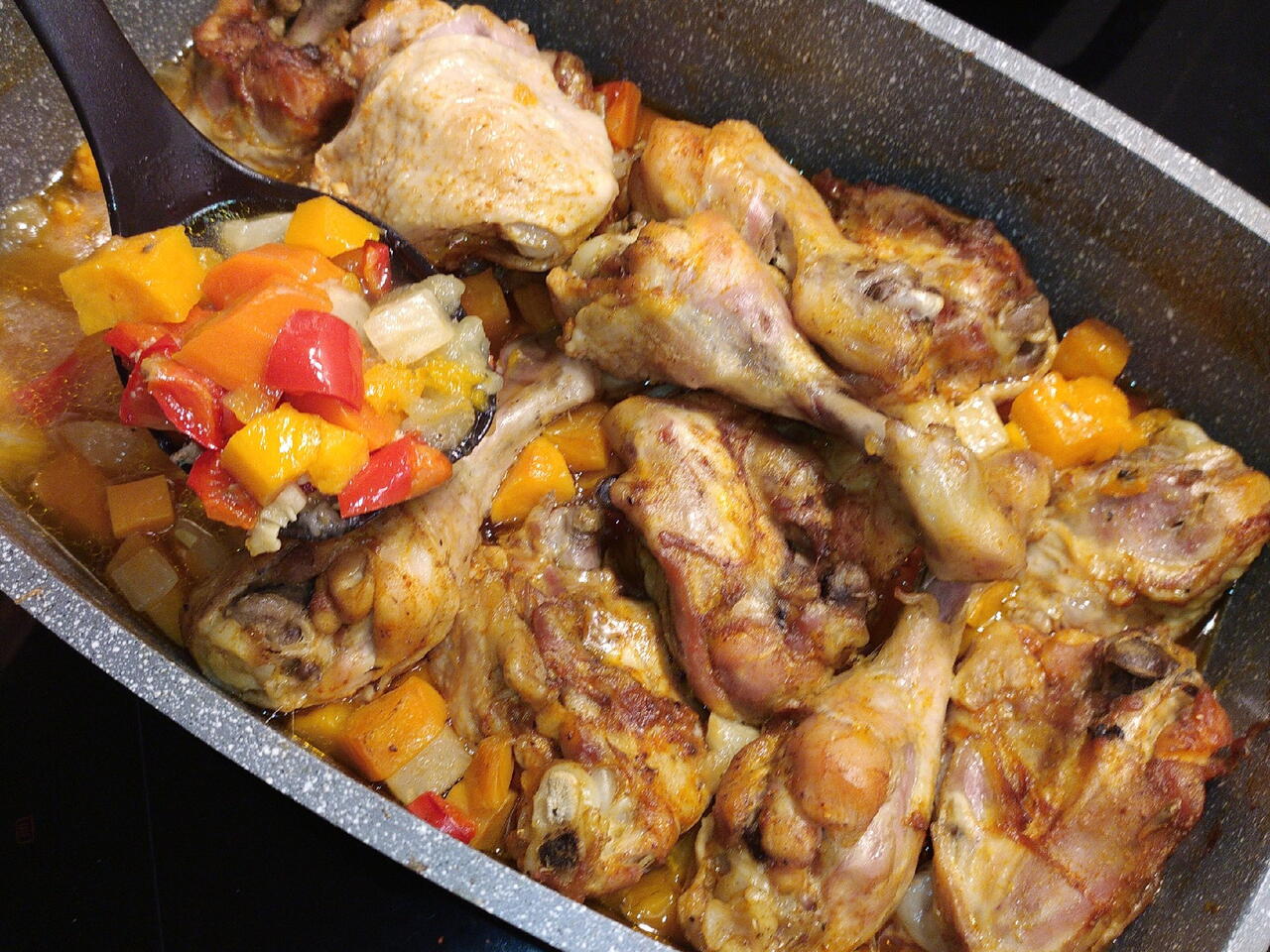 Я всегда "знакомлю" мясо со специями в пакете - быстрее и удобнее. В пакет с курицей насыпаем соль, специи и перемешиваем. Раскладываем на овощи, закрываем крышкой и убираем в духовку на час при 180-190°. Далее, по готовности
