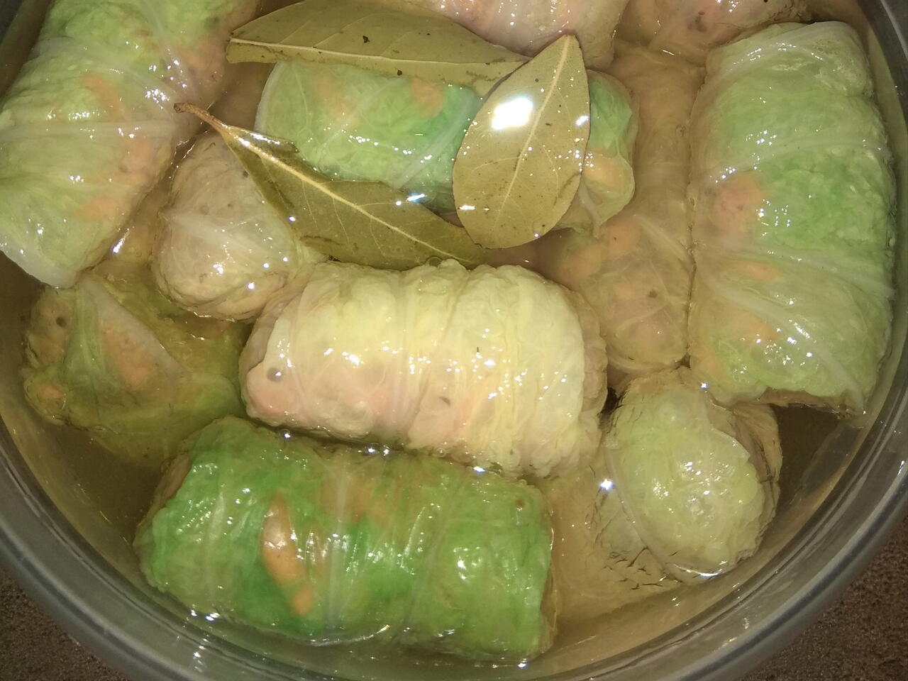 Начинку разложить на капустные листы, свернуть голубцы и уложить их в ёмкость где они будут мариноваться