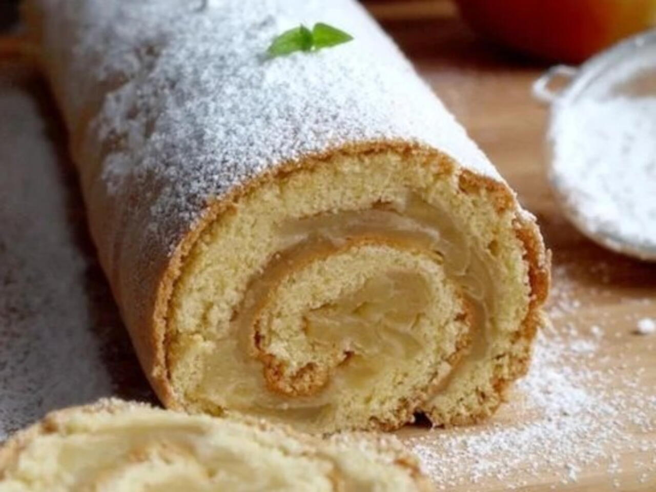 Извлеките противень из духовки и переверните пирог тестом вниз. Аккуратно удалите пергаментную бумагу и сверните рулет вдоль длинной стороны, яблоками внутрь. Оберните рулет в ткань или в бумагу и дайте постоять до полного остывания. Перед подачей посыпьте рулет сахарной пудрой, смешанной с ванильным сахаром.