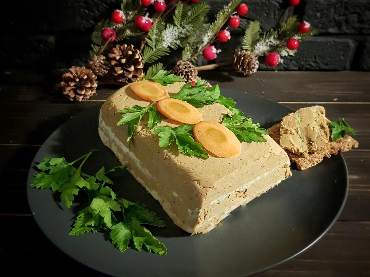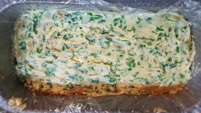 В форму положить слой остывшего паштета, слой масла с петрушкой.