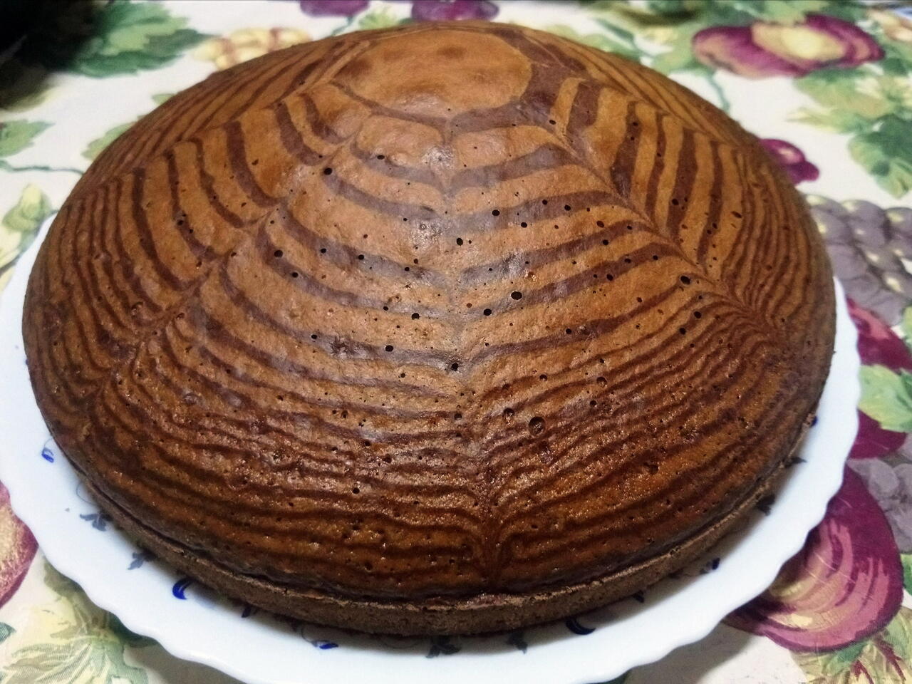 Затем проведите ложкой несколько полосок от края чаши к середине. Получится красивый узор. Пока оба цвета не перемешались между собой, поставьте чашу в мультиварку, опустите крышку, установите программу «Выпечка», включите.