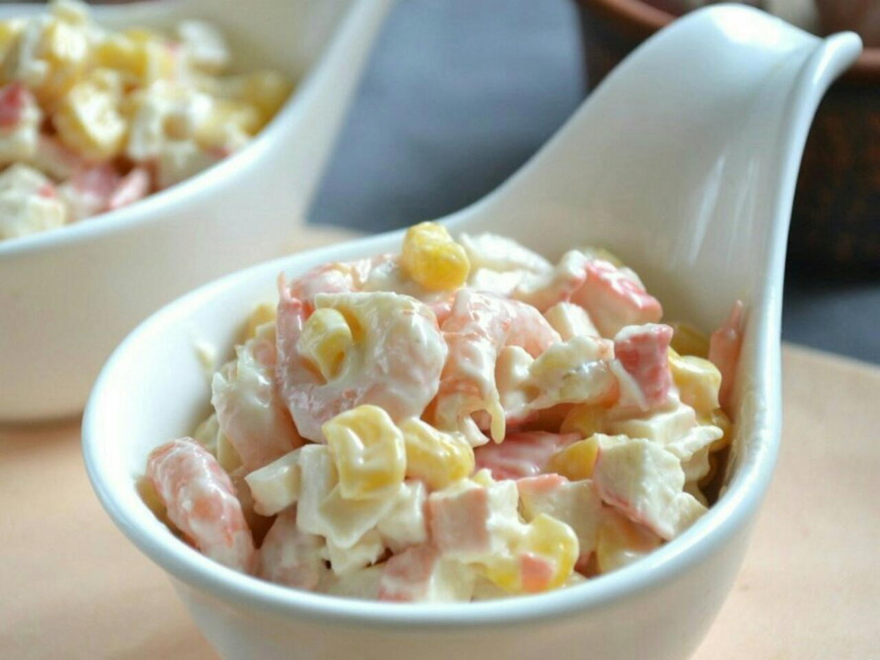 Смешиваем измельчённые крабовые палочки, консервированную кукурузу и креветки