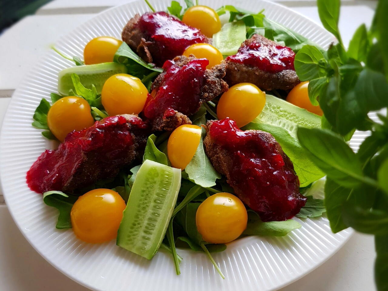 Рукколу сбрызнуть оливк маслом,, положить черри и огурцы нарезанные произвольно, сверху печень и полить клюквенным соусом.
