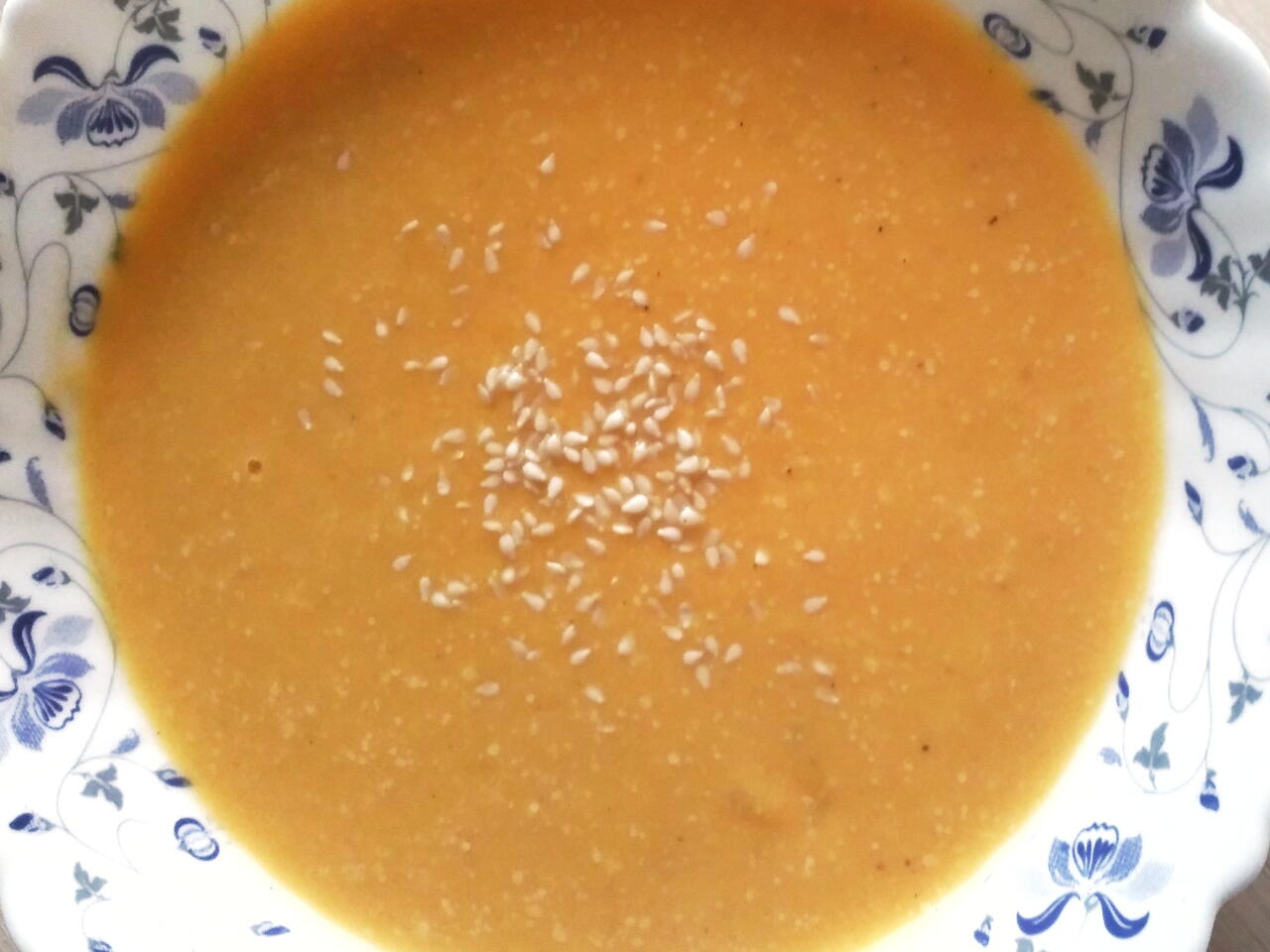 Разлить по тарелкам, украсить тыквенными семечками (у меня кунжут)