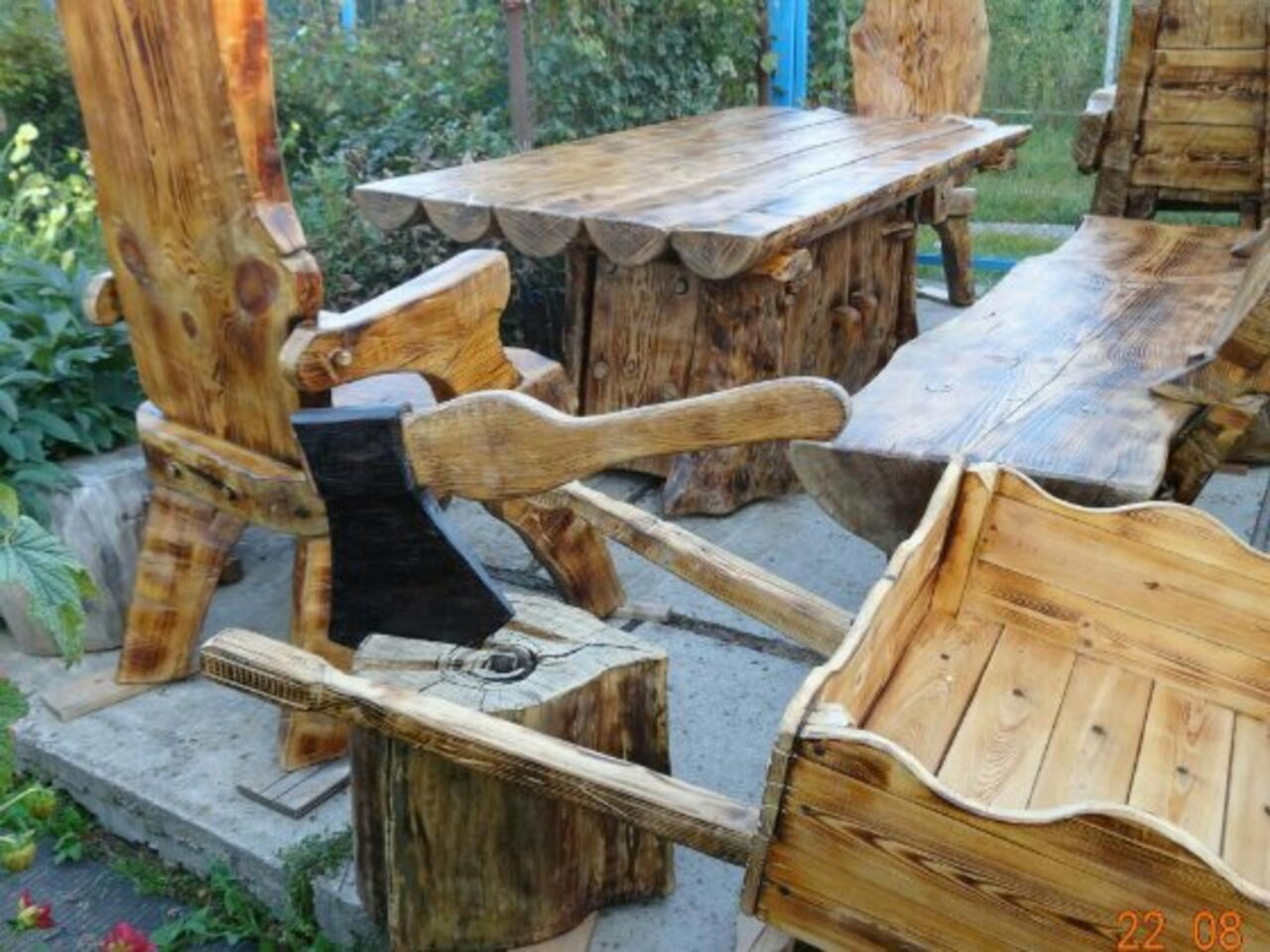 стол..четыре кресла...скамья..кресло-качалка