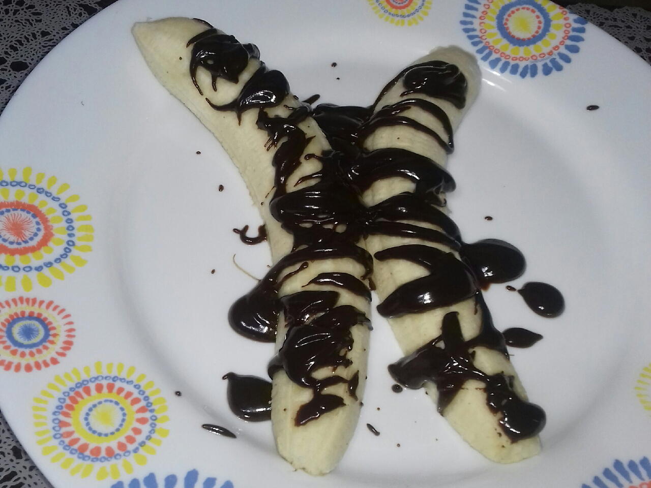Banán rozdelíme na polovicu. Dáme na tanier, zoberieme lyžicu a na banány môžme dávať čokoládu.