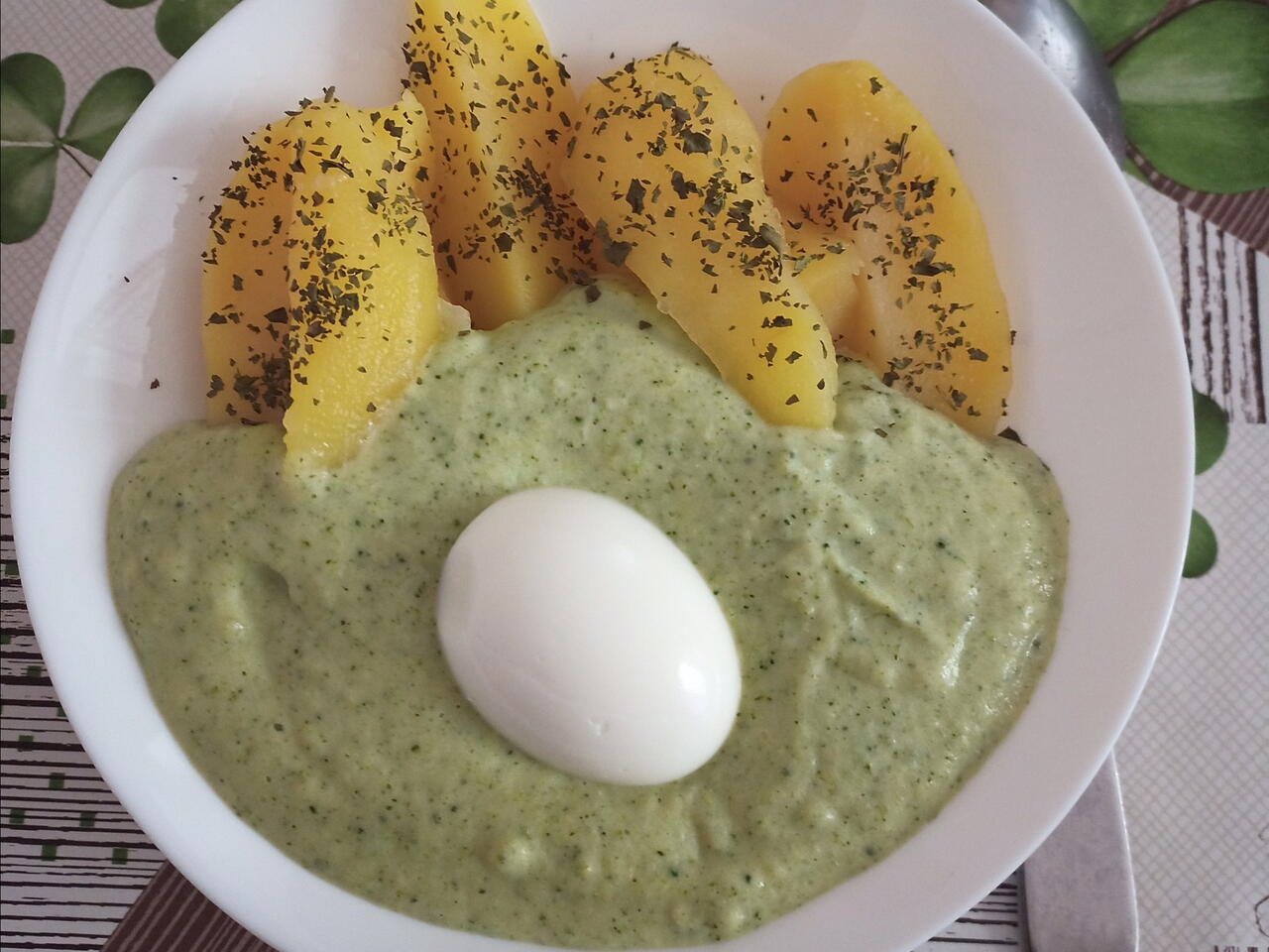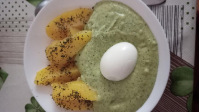 Podávame so zemiakmi posypanými koriandrom a vareným vajíčkom.