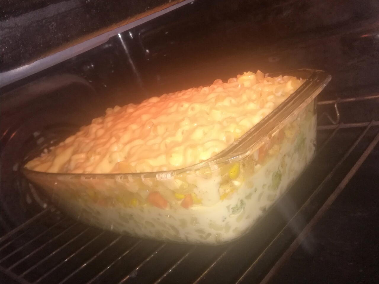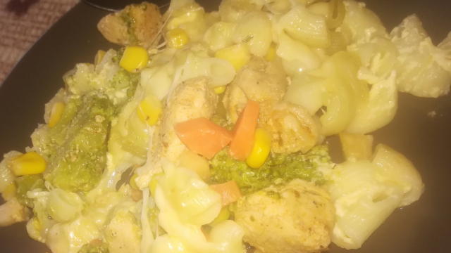 Do sklenenej myski dáme na spodok cestoviny (posolíme), na cestoviny dáme mäso naň brokolicu a zeleninku.. Vajíčka si rozmiešame s mliekom a smotanou a celé to polejeme. Dáme do rúry na 180°C na 25 minút vyberieme nato poukladáme nastrúhaný syr a dáme ešte do rúry aspoň na 5 minút.