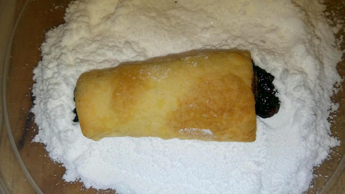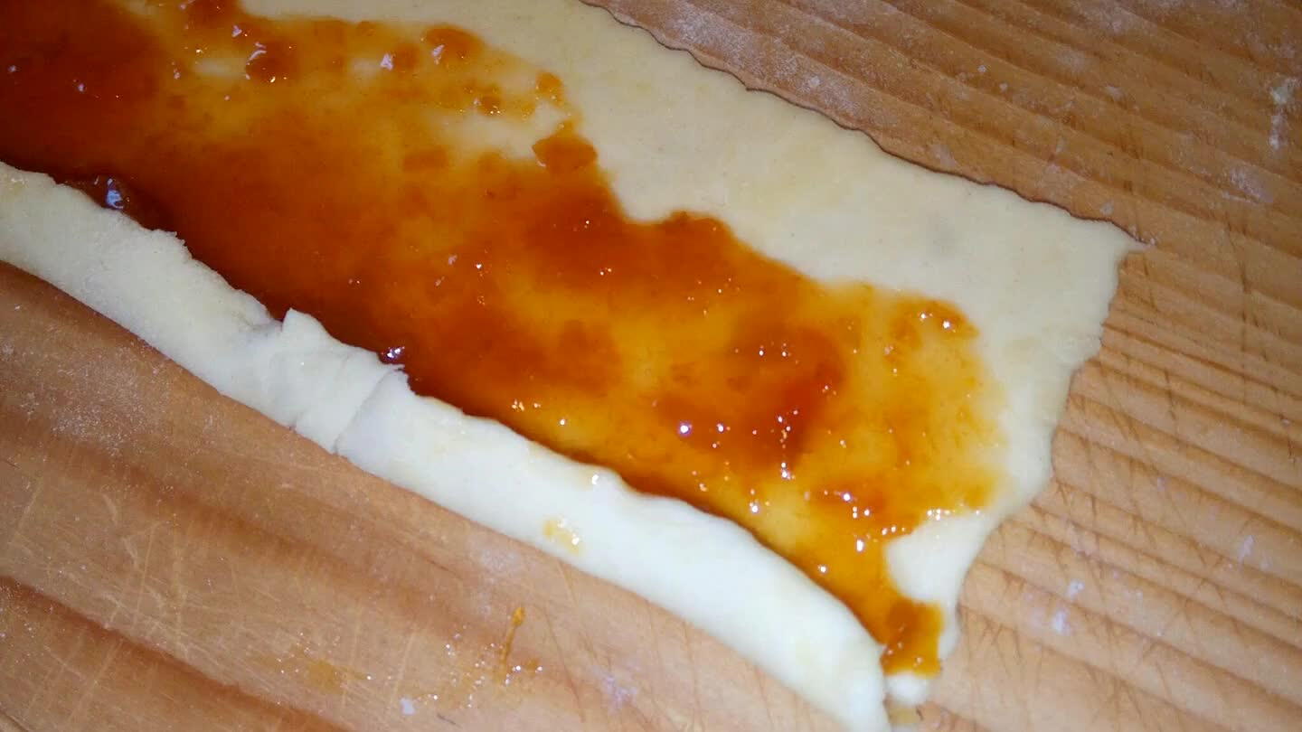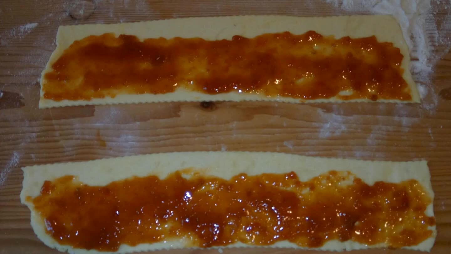 Polovicu cesta vyvaľkáme na obdľžnik. Hrúbka cesta 3 mm. Zvyšné cesto necháme v chladničke.