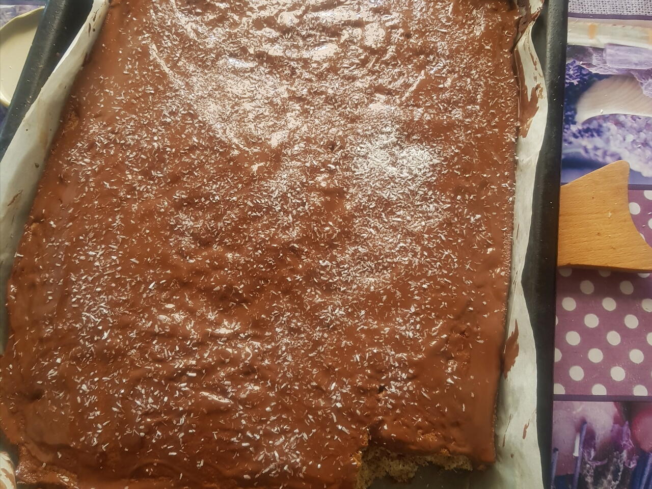 Vyslahame vajcia s cukrom pridame ostatne suroviny dame na plech vymasteny vysypany mukou alebo na papier na pecenie a pecieme na 180C 20 minut zavisi podla rury..po upeceni potrieme dzemom po vychladnuti struhanou alebo roztopenou cokoladou a mozme pridat aj kokos.