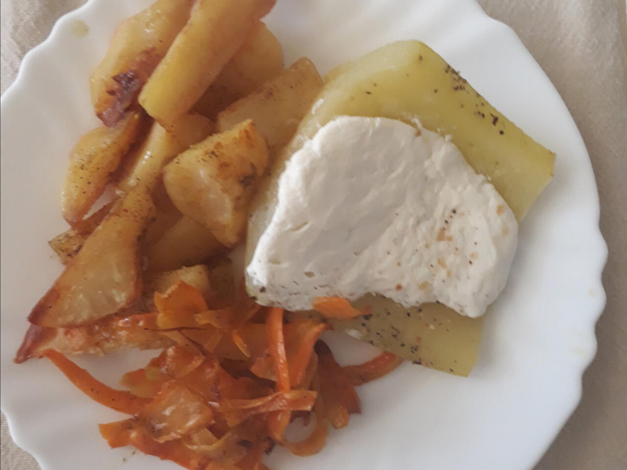 Keď sú zemiaky uvarené nakrájame ich a dáme ich na plech. Posypeme kurkumou, soľou a korením. Navrch dáme trocha bravčovej masti. Nakraj plechu dáme cuketu. Na vrch cukety ak chcete môžte dať kyslú smotanu
