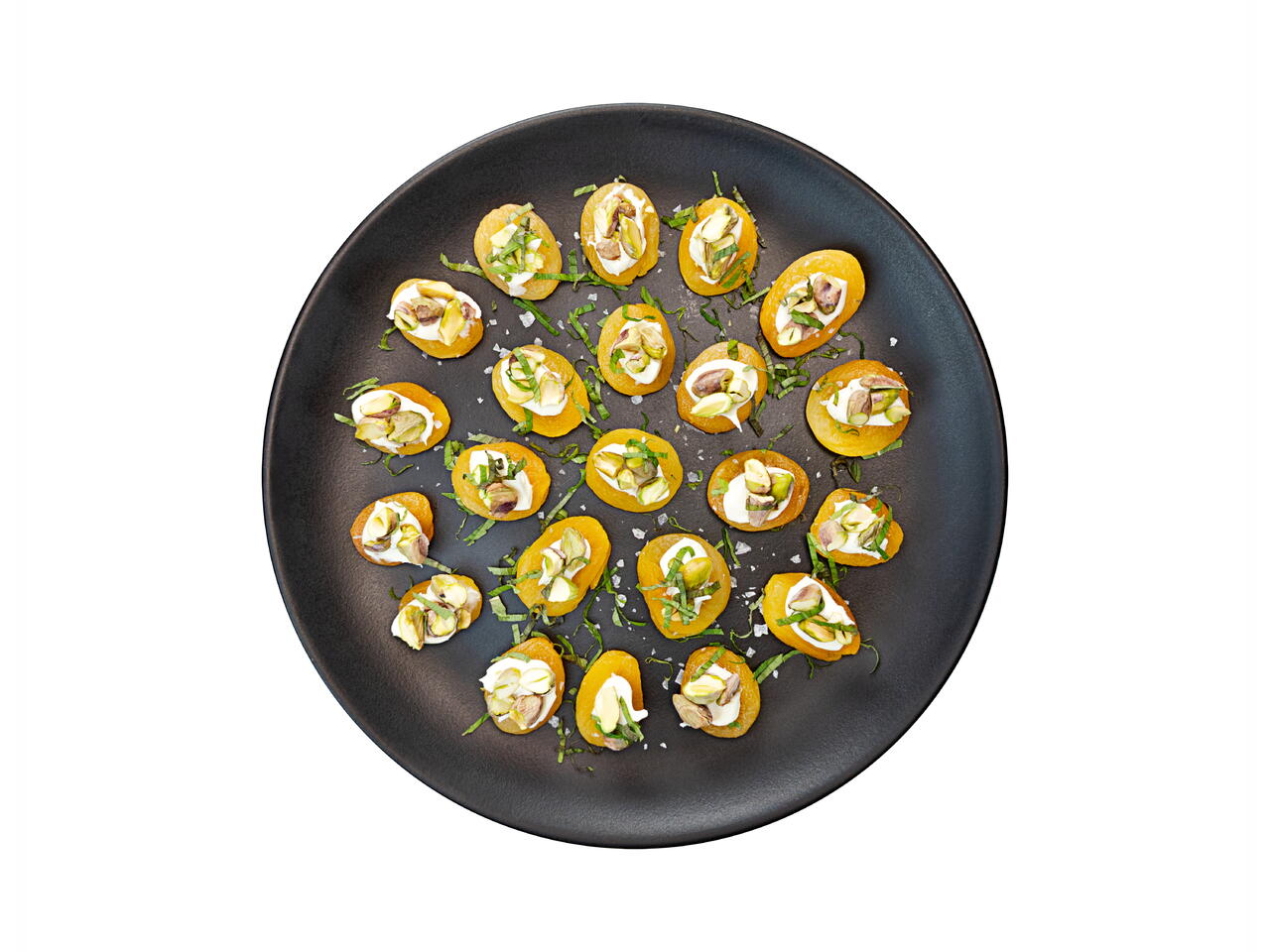 Top each apricot with a few shelled pistachios. I decided to chop them up a bit to easily adhere them to the mascarpone.