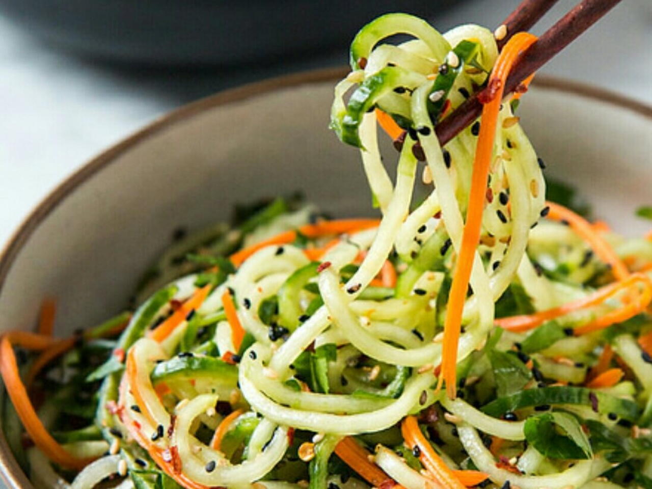 Once the cucumber has drained for a bit, spread it onto a clean dish towel, and gently pat out as much moisture as you can. Place the "noodles" into a large bowl, and add 2-3 TBSP dressing, to coat. Toss to combine, then garnish with additional sesame seeds, sliced scallions, and fresh cilantro. Serve immediately.