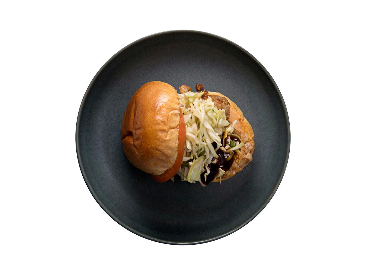 Top the chicken with the katsu sauce, cabbage slaw, and the top bun.