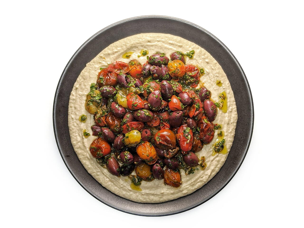 To serve, spread the bean puree out on a platter. Top with the roasted tomato salad.