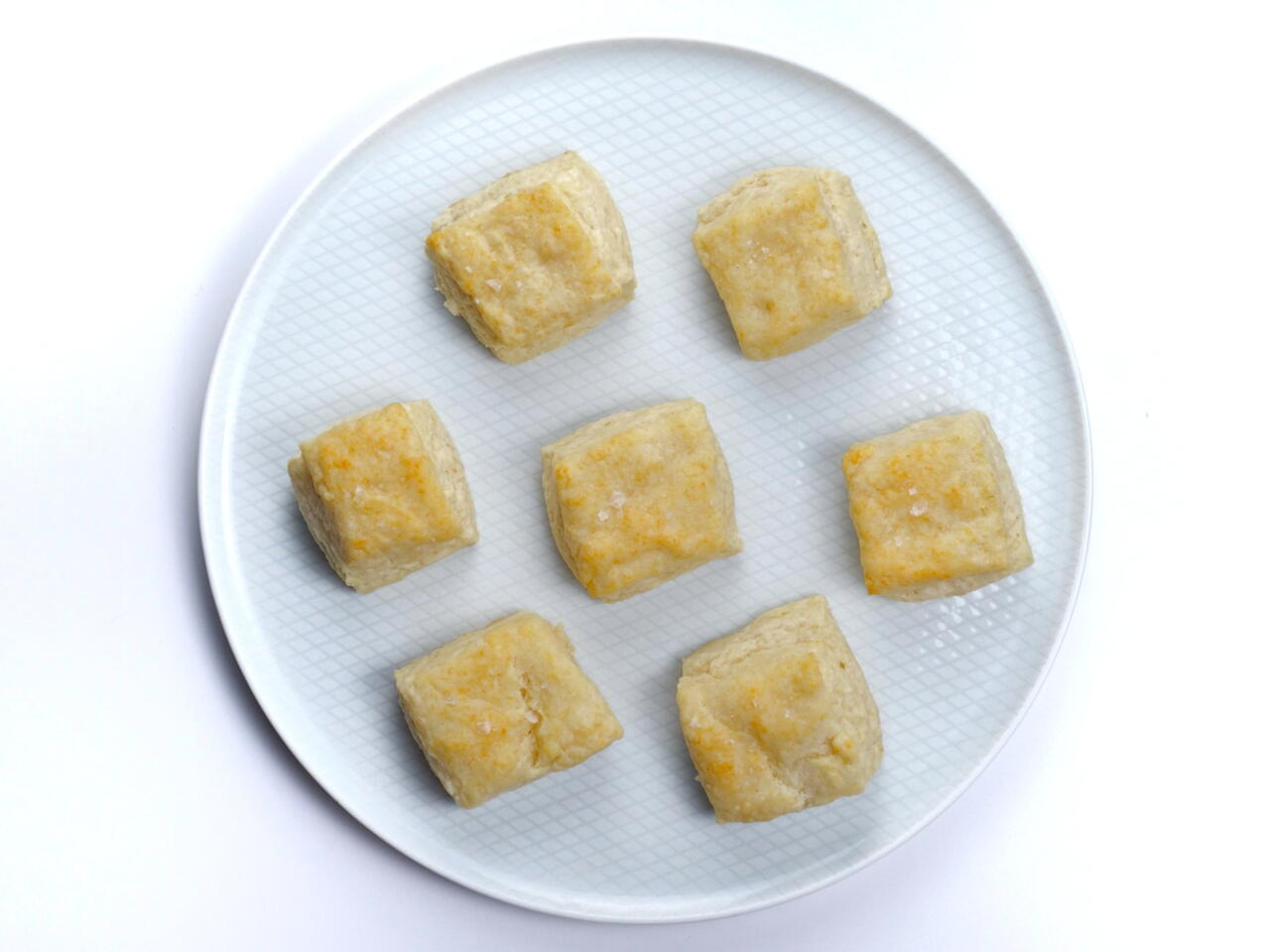 This is optional but recommended. Hot out of the oven, coat each biscuit with a little melted butter and a pinch of salt.