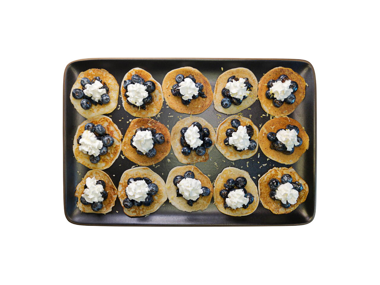 Add the sugared blueberries and a dollop of whipped cream to the top of the ricotta pancakes.