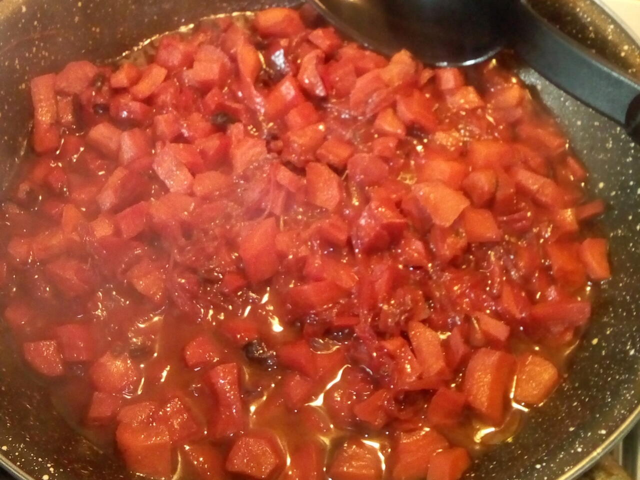 Add liquid to personal taste - beet juice OR orange juice OR apple juice OR similar (wine is grape juice...). Bring to simmer and cover. Stir occasionally, checking liquid level. Cook until carrot is the preferred consistency. Add liquid if necessary to further cooking, for those who like mushy veggies instead of defined pieces.