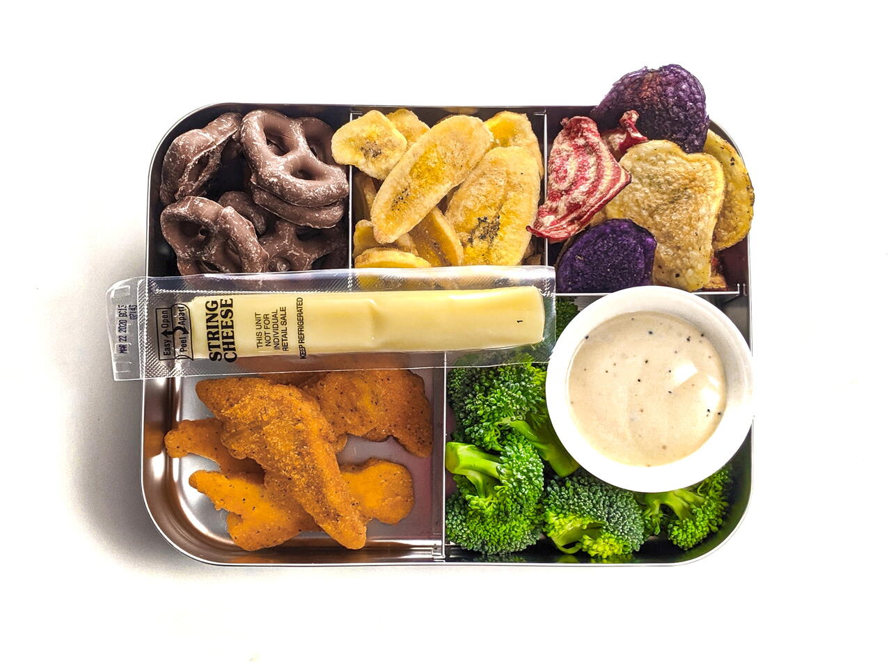 Put the prepared broccoli and nuggets into the box with the ranch dressing, pretzels, veggie chips, and banana chips. Pack the string cheese on the side.