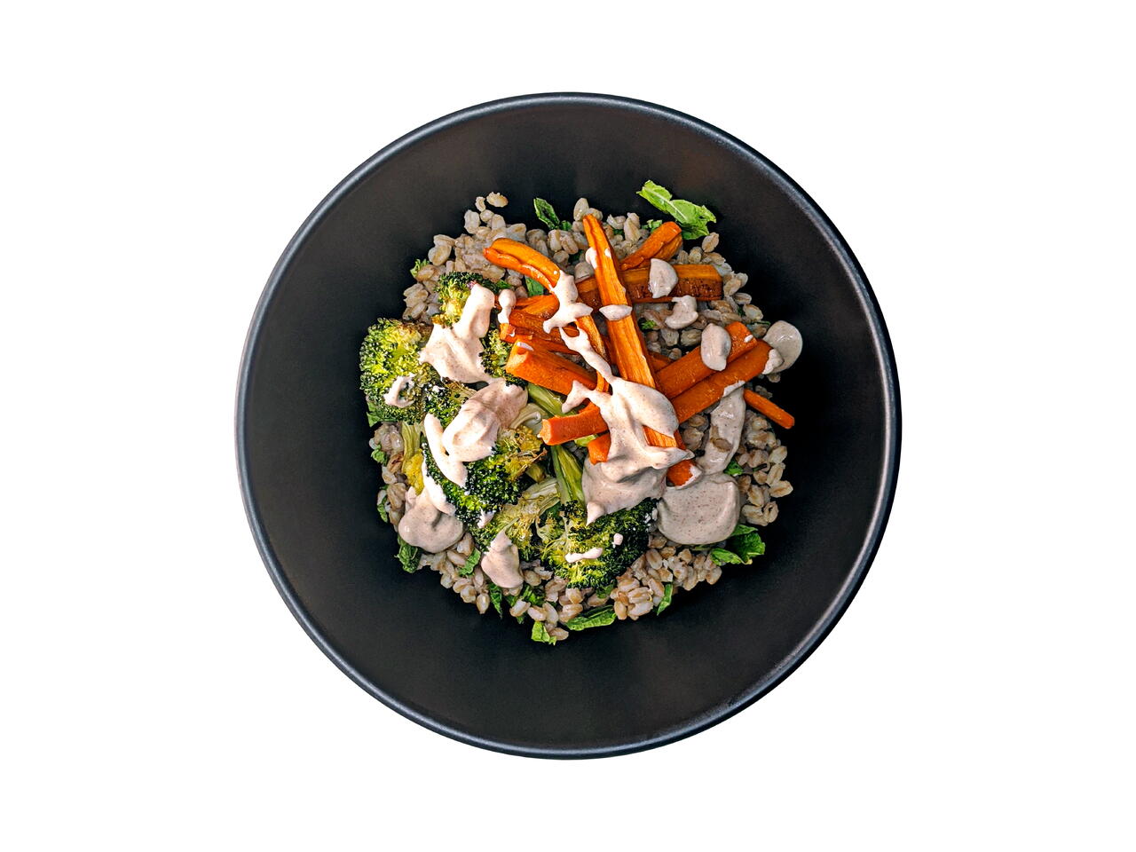 Roasted carrots and broccoli with farro and a spiced yogurt sauce. Simple, fresh and healthy.