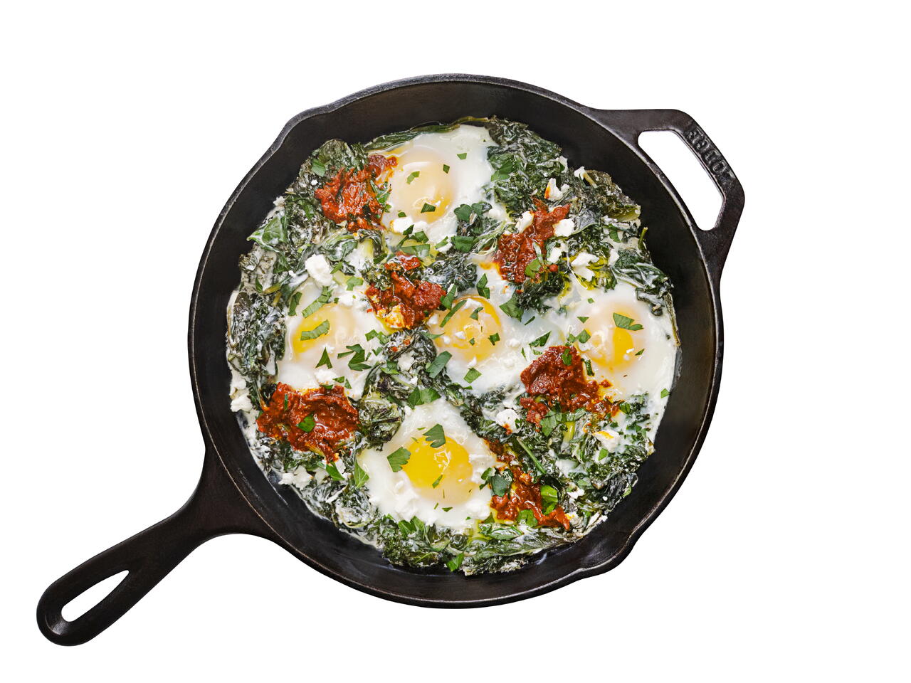 Make 5 wells in the greens mixture and crack an egg into each one. Cover the skillet with a lid and cook the eggs until the whites are fully cooked.