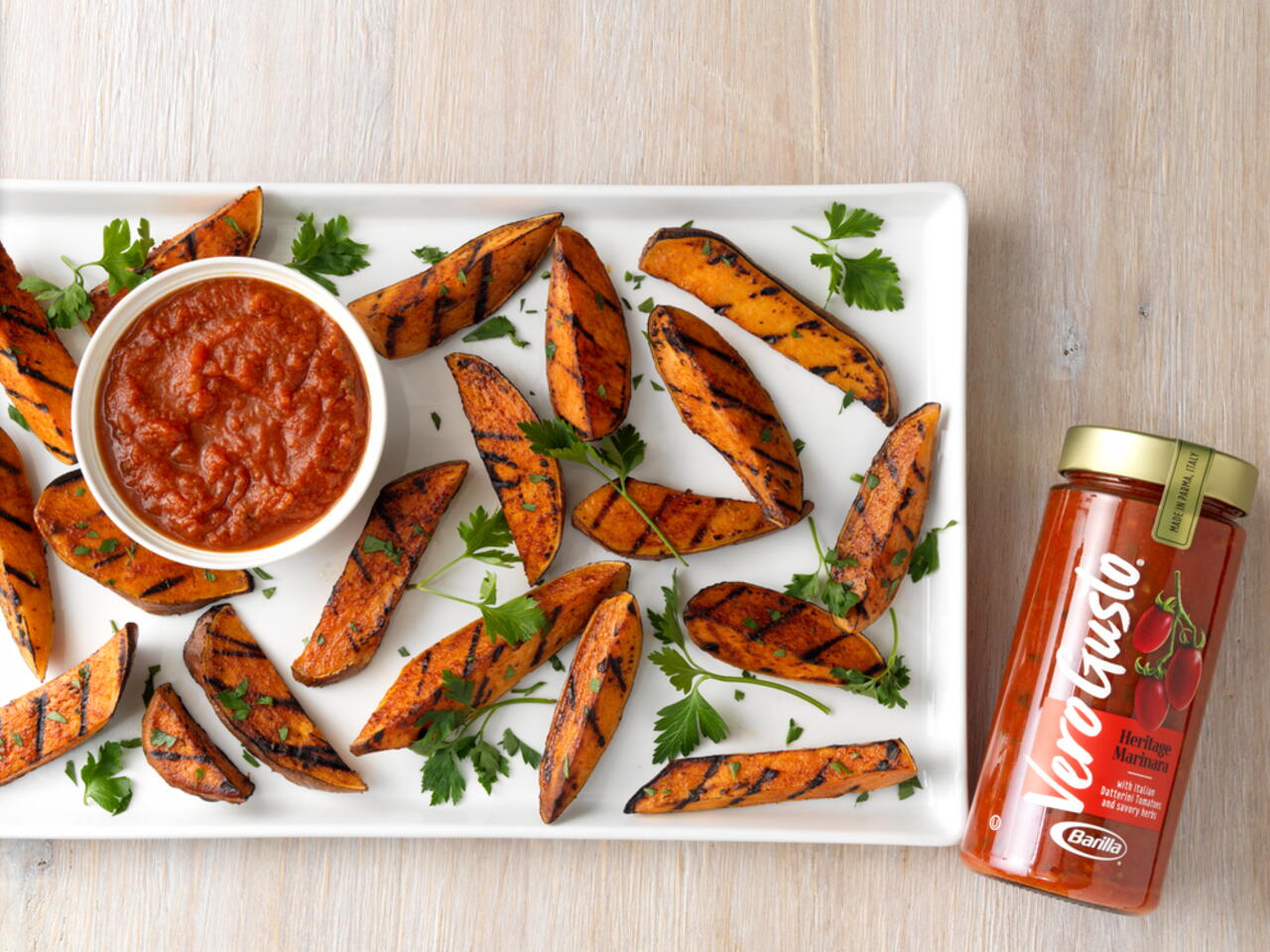 Transfer the sweet potatoes to a plate, drizzle with Vero Gusto®, and garnish with parsley.