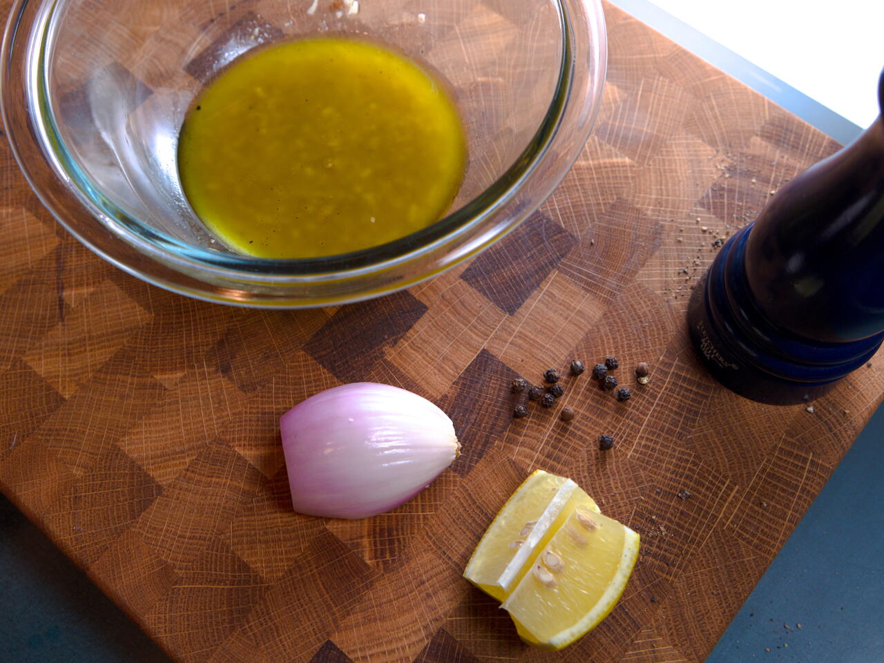 Add some fresh lemon juice. Let it sit for a few minutes to soften the shallot and allow the flavors to mingle.